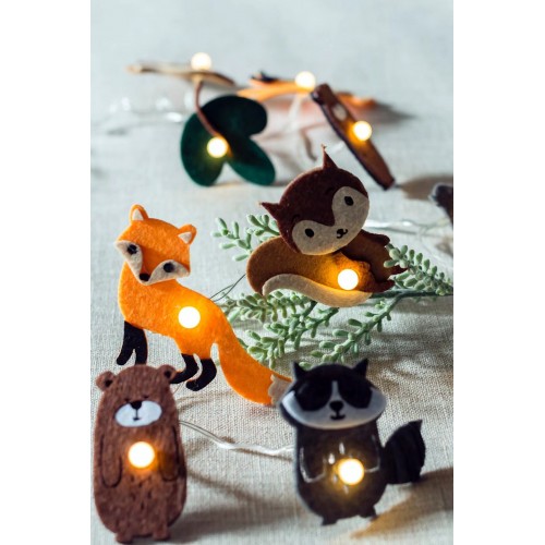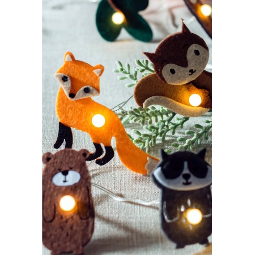 Sonbahar konseptli orman hayvanları, tilki,ayı,sincap,rakun ve meşe palamutundan oluşan keçeli led ışık zinciri
