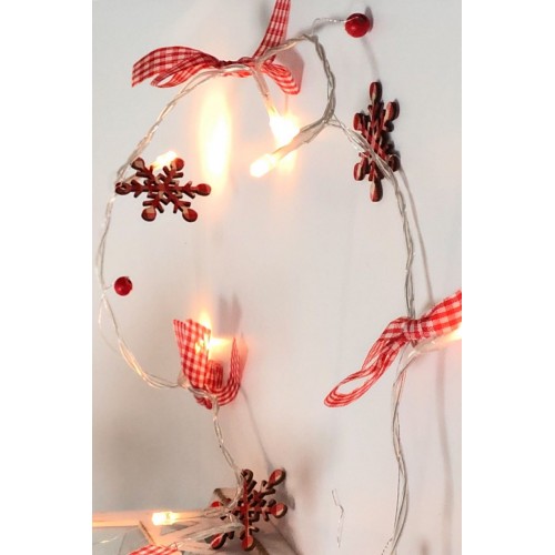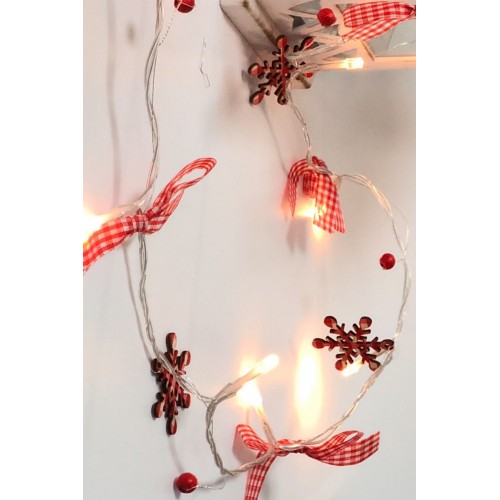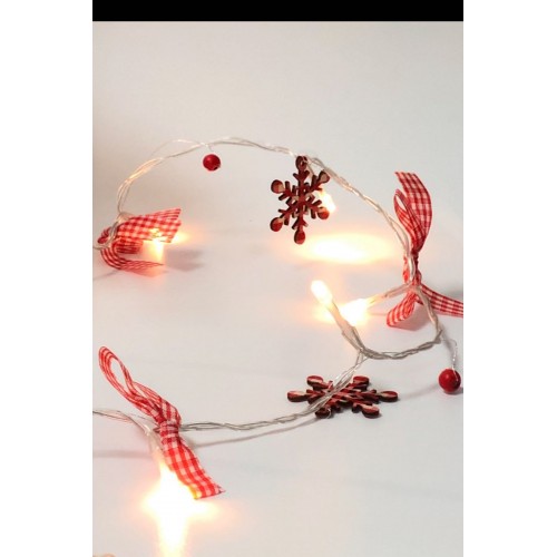 Kırmızı desenli kumaş kurdela,kokina ve mdf kartanelerinden oluşan 20 ledli süsleme ışığı.