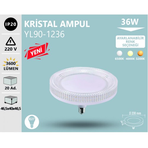 - Ürün Kodu: 36W KRISTAL AMPUL E27 3 RENK BEYAZ GÜNIŞIĞI ILIK BEYAZ