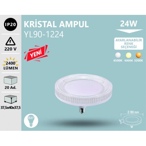 - Ürün Kodu: 24W KRISTAL AMPUL E27 - 3 RENK BEYAZ GÜNIŞIĞI ILIK BEYAZ