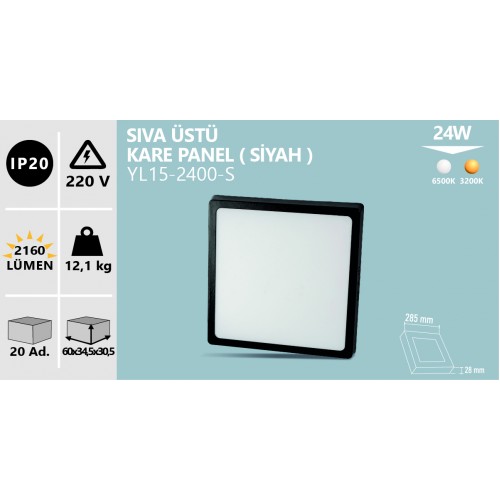 24W SIVA ÜSTÜ KARE PANEL SİYAH KASA BEYAZ GÜNIŞIĞI