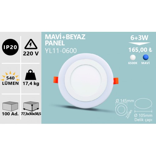 Etiketler: 6+3W SIVA ALTI MAVİ+BEYAZ 3 FONK. LED PANEL